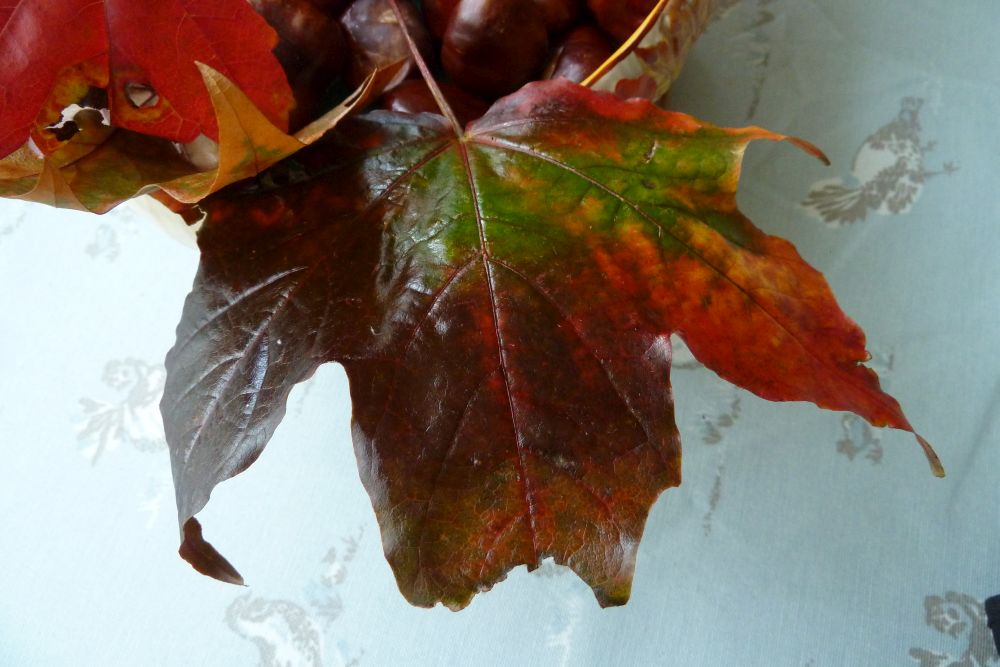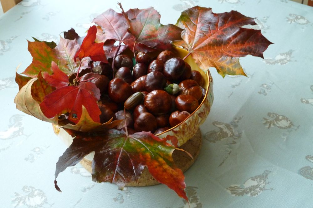 There is nothing of substance to this post, except that I’m just home from the park and emptied my (and D’s) pockets of conkers and acorns. Adding some outrageously colourful leaves, we’ve used them to make a table centrepiece to brighten up the kitchen.
