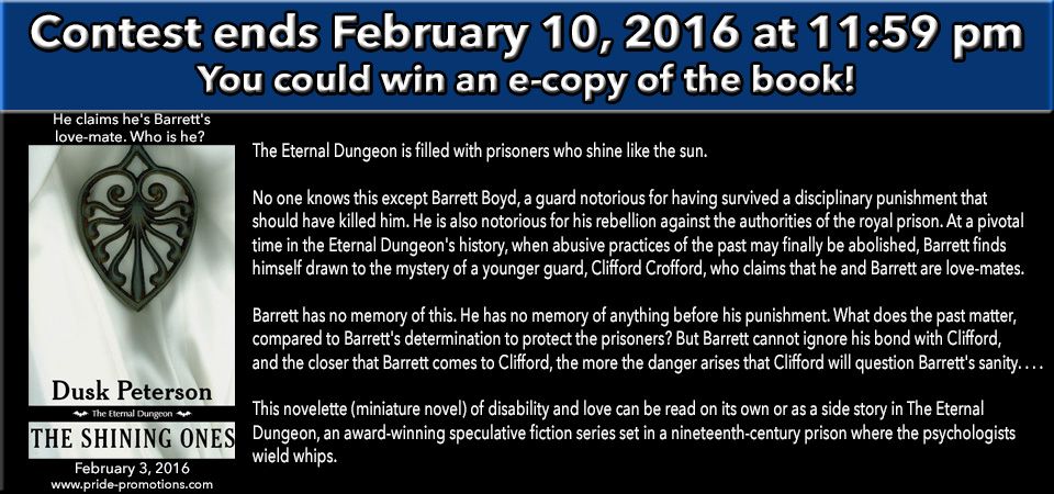 I’m delighted to host Dusk Peterson here today to mark the release of the latest tale in the Eternal Dungeon series. The Shining Ones is a novelette (miniature novel) of disability and love, and can be read on its own or as a side story in The Eternal Dungeon, an award-winning speculative fiction series set in a nineteenth-century prison where the psychologists wield whips.