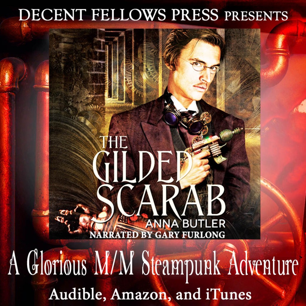 Well, whatever the spoken word equivalent is, The Gilded Scarab is now available on audio. It’s the first of the Lancaster’s Luck trilogy – the steampunk m/m coffeehouse adventure-cum-romantic-thingamajig starring the inimitable Rafe Lancaster and the love of his life, Ned Winter.