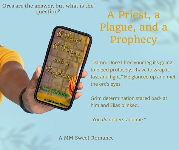 M.D. Grimm has a new MM fantasy romance out (ace, bi, demi): A Priest, a Plague, and a Prophecy (have to say that I LOVE that title!). And there’s a giveaway.